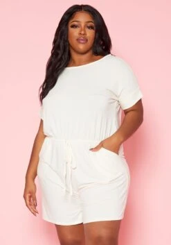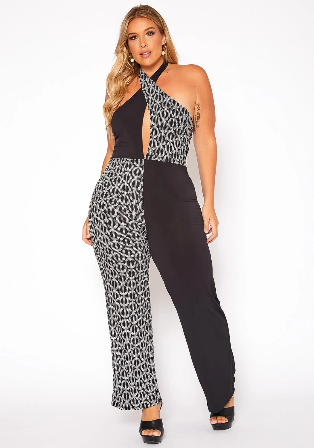 Beautiful plus size women’s jumpsuit in halter neck design, geo print splice, open back style and flare leg hem.