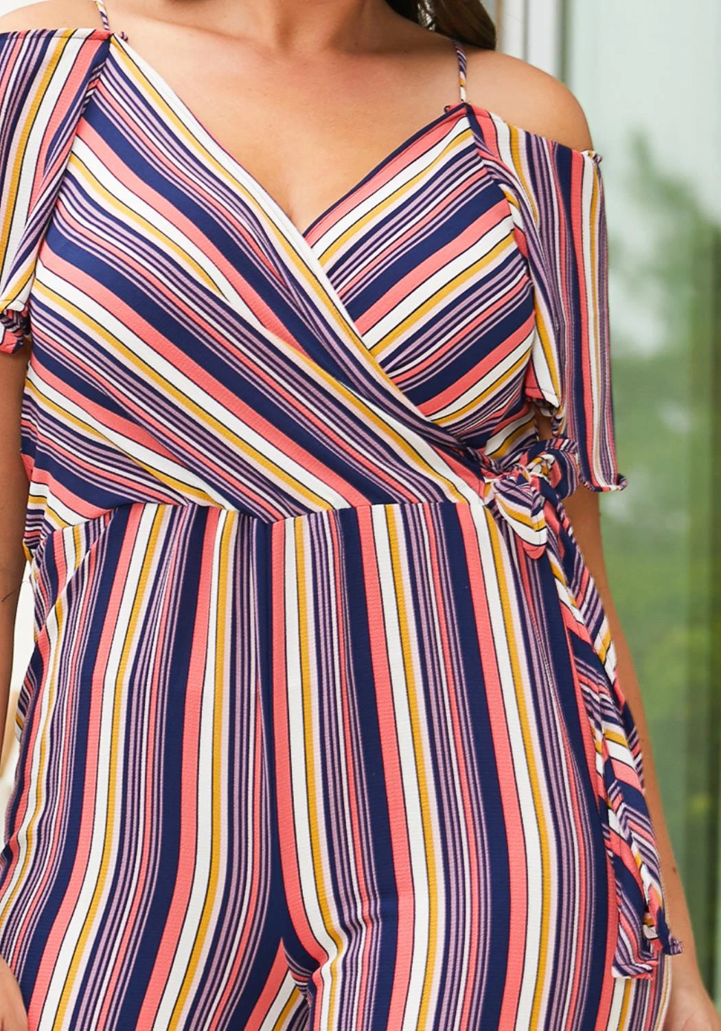 Plus size casual stripe print jumpsuit with cold shoulder cutout.