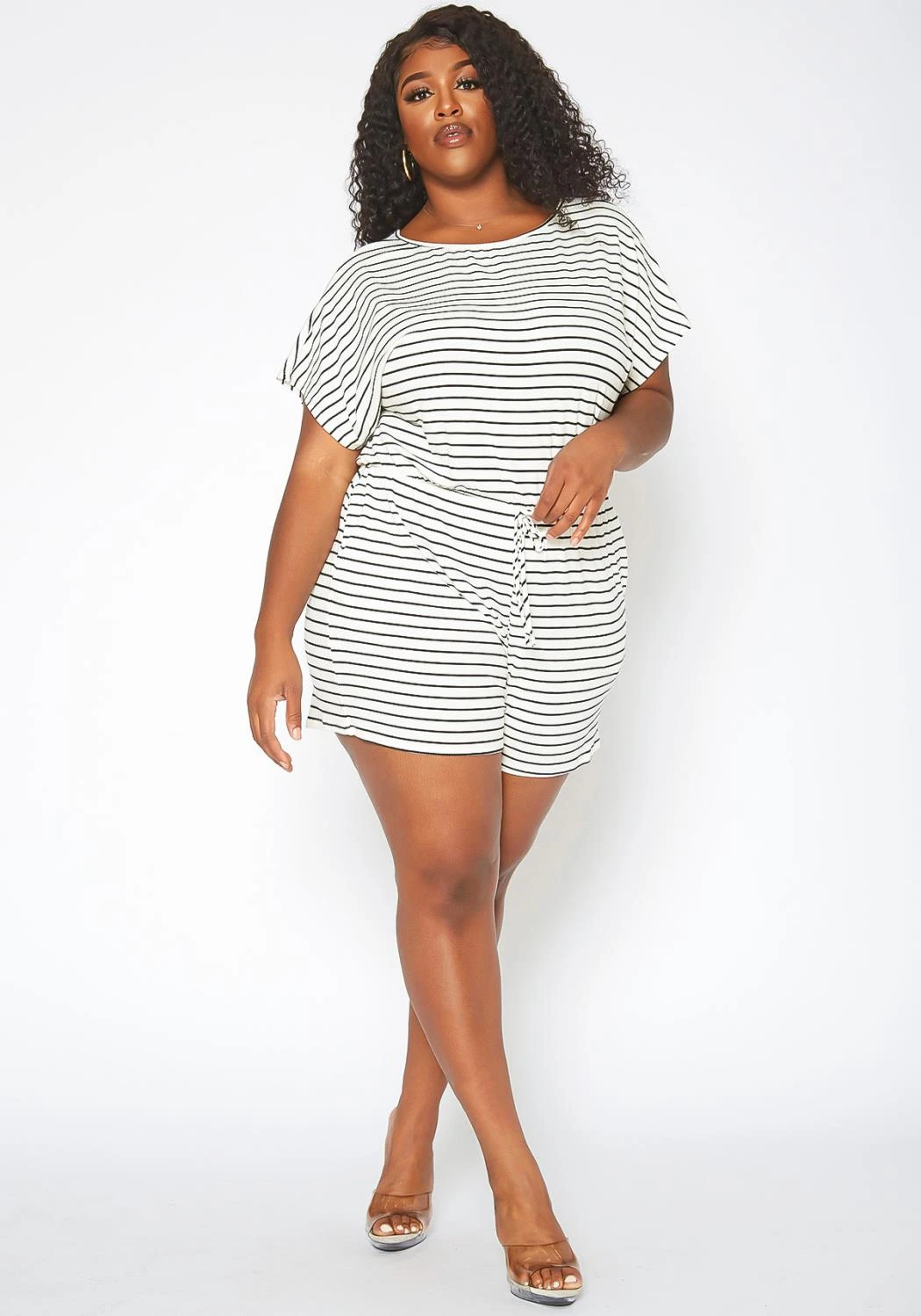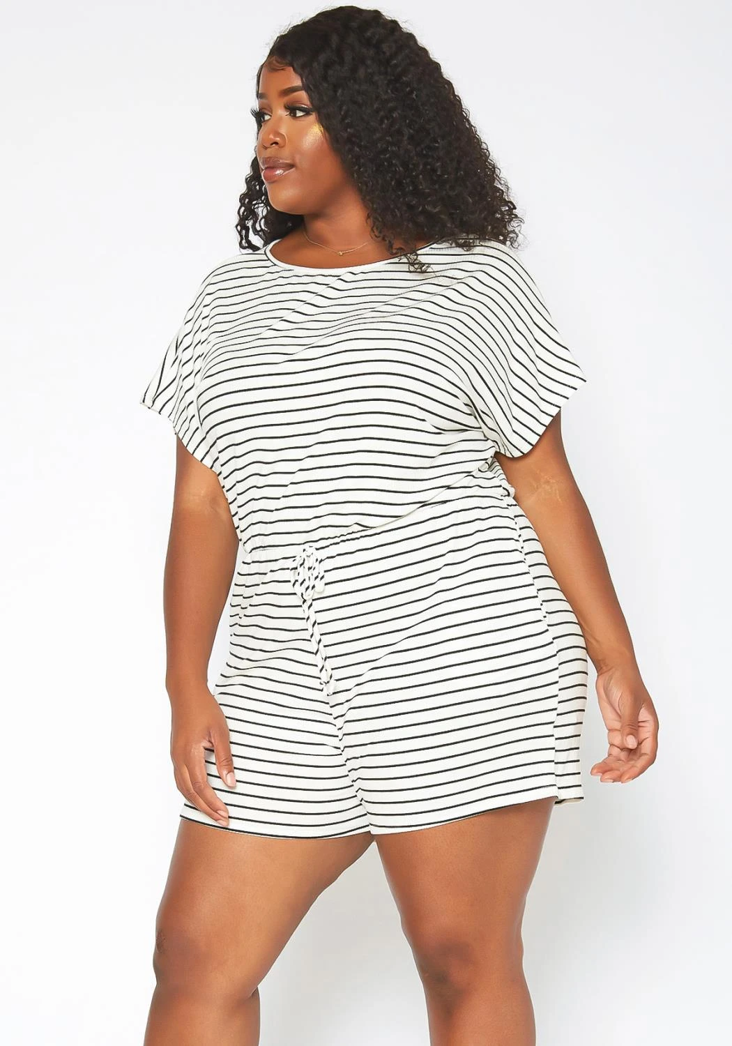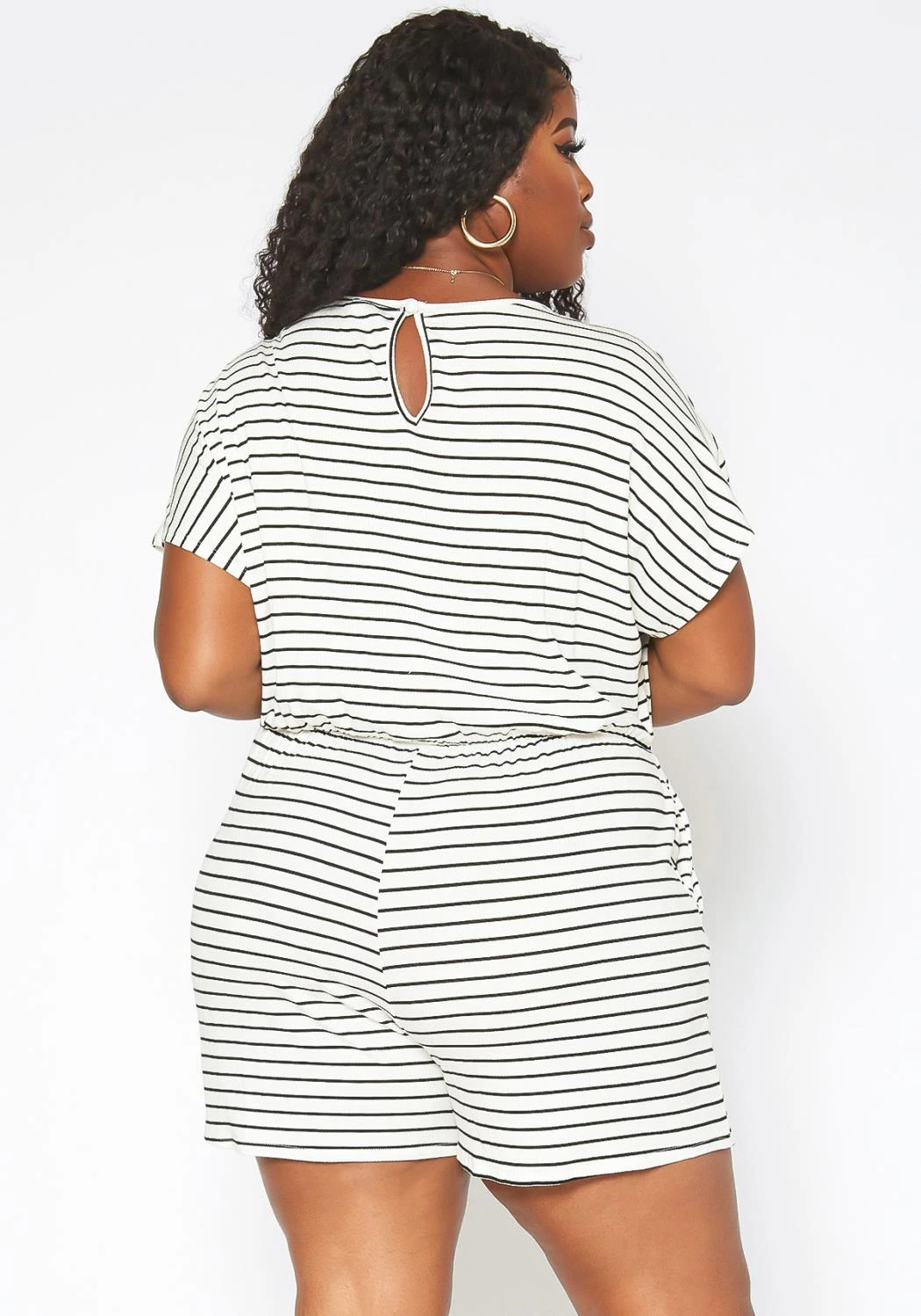 Casual plus size women’s relaxed fit romper in striped pattern, round neck, short sleeves, pocket ascent, elastic waistline, faux bow tie ascent and back keyhole button closure.