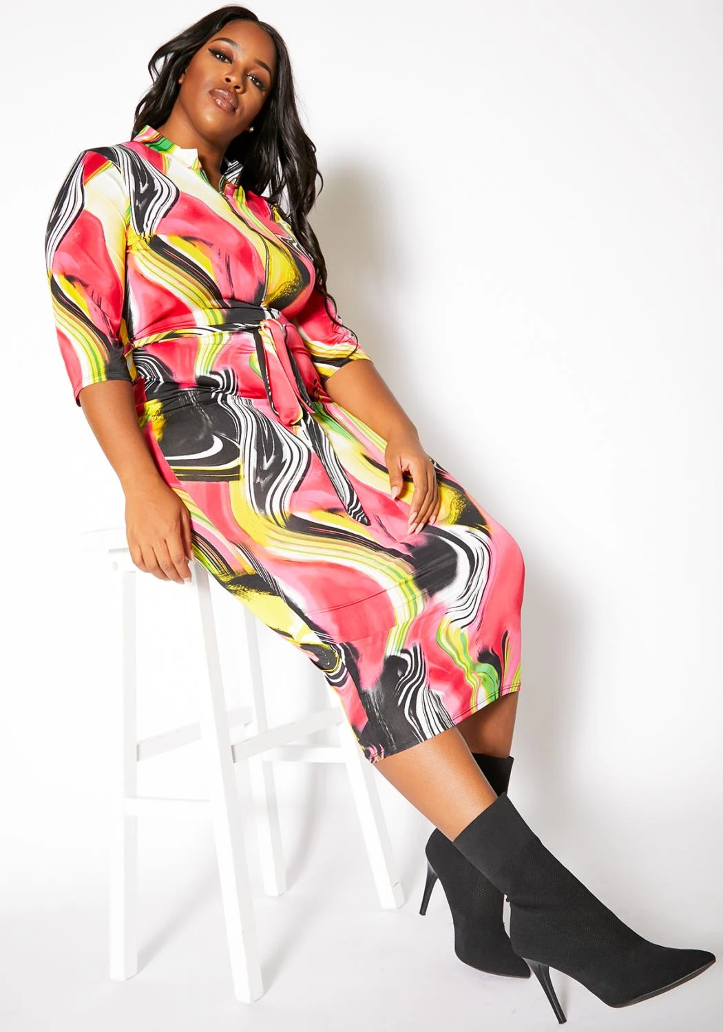 Look like a gorgeous art piece in our vibrant marble patterned womens midi dress. Features a mid zip up front closure, mandarin collar, elbow cropped sleeves and includes a matching waist tie.