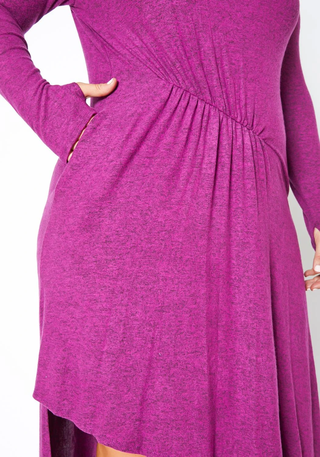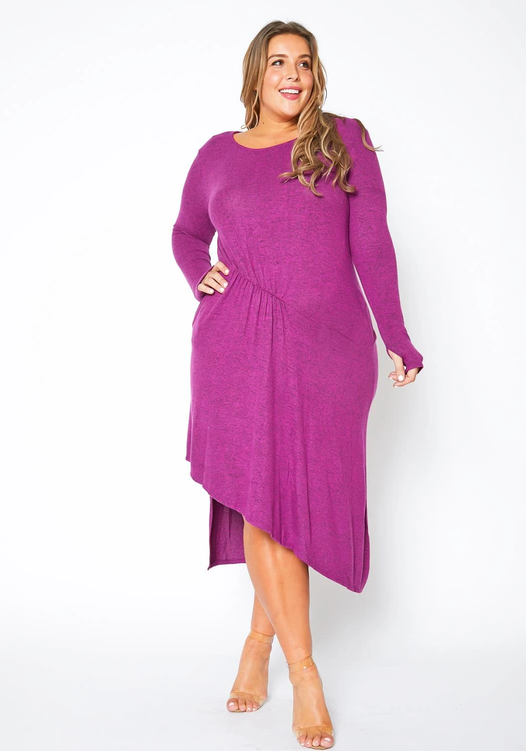 Plus size women’s midi dress features fitted long sleeves with thumb keyhole, ruched front detail, crew neck style and a front asymmetric cut.