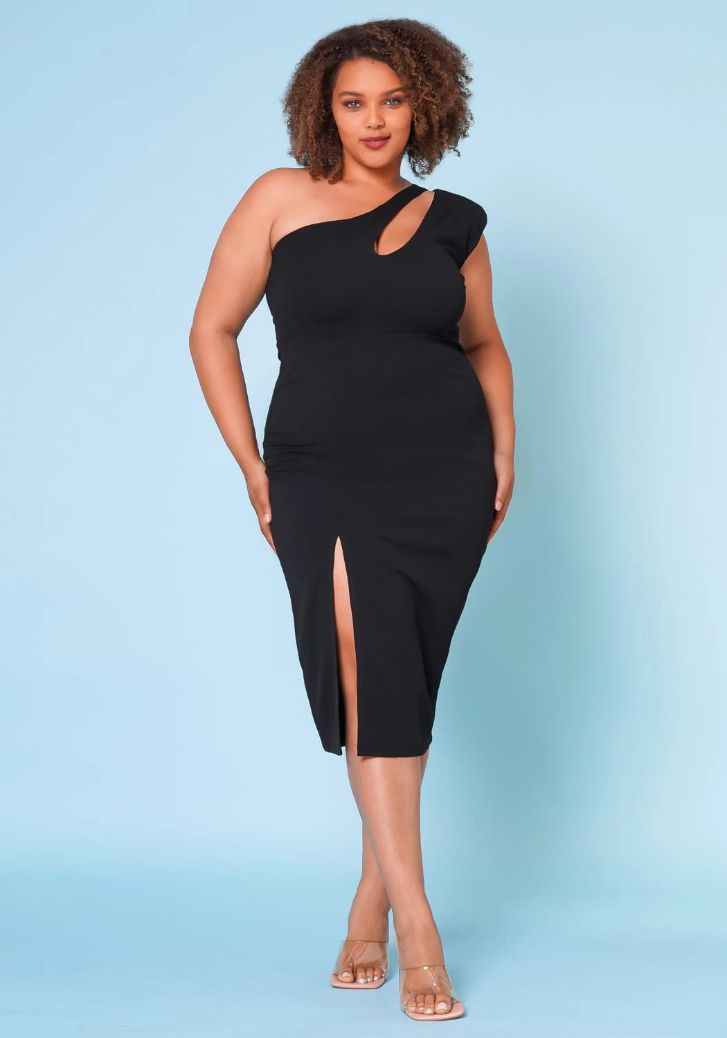 Make an impression in this plus size women’s cocktail midi dress which features an asymmetric one sleeve design, slit hem details and back zipper closure.