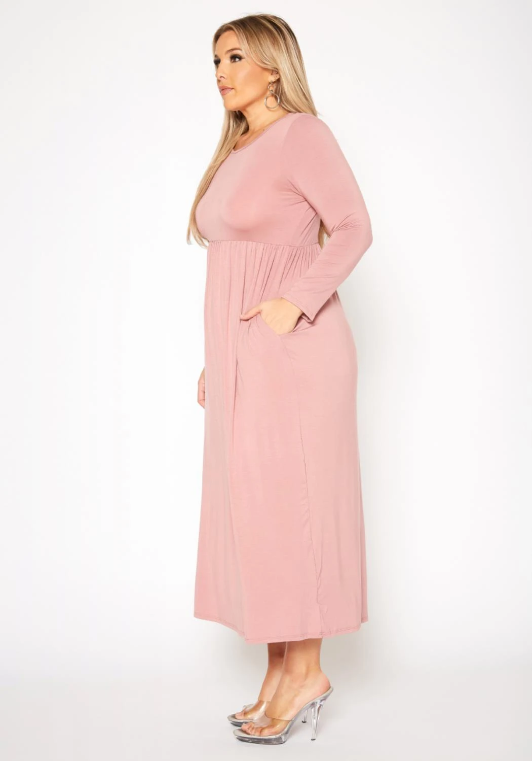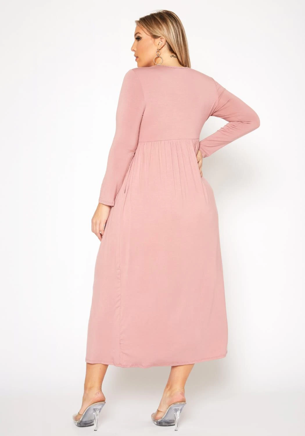 Plus size women’s casual maxi dress in fit to flare design, solid color, fitted long sleeves and round neck style.