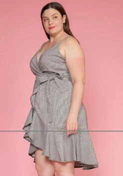 Fancy mini dress for plus size women in golden brocade pattern, collar neck style, button front closure, fitted long sleeves, buttoned wrist cuffs and curved hem.