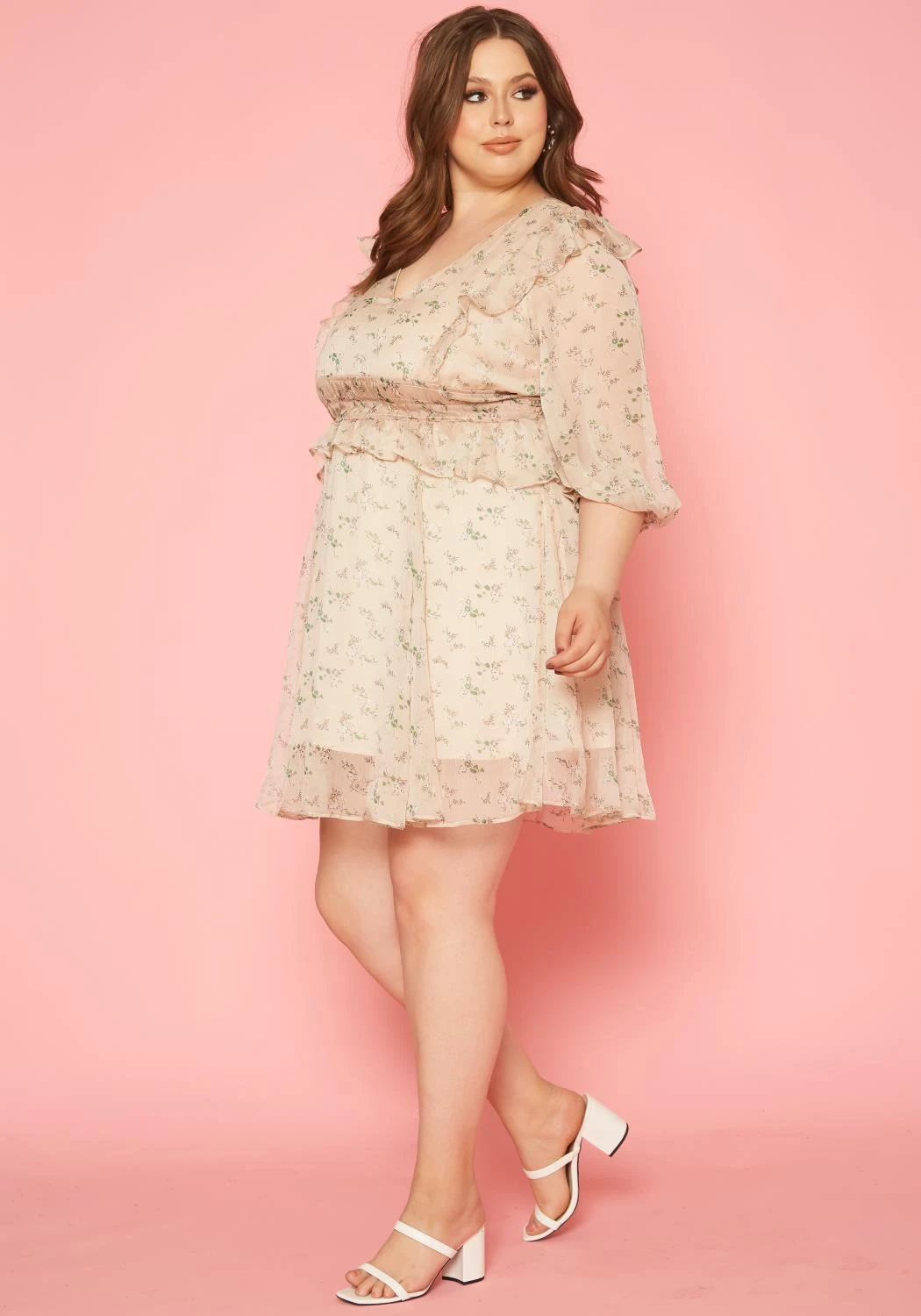 Plus size women’s mini dress in floral pattern, v-neck style, open back design, 3/4 long sleeves, ruffle trim details and chiffon style.