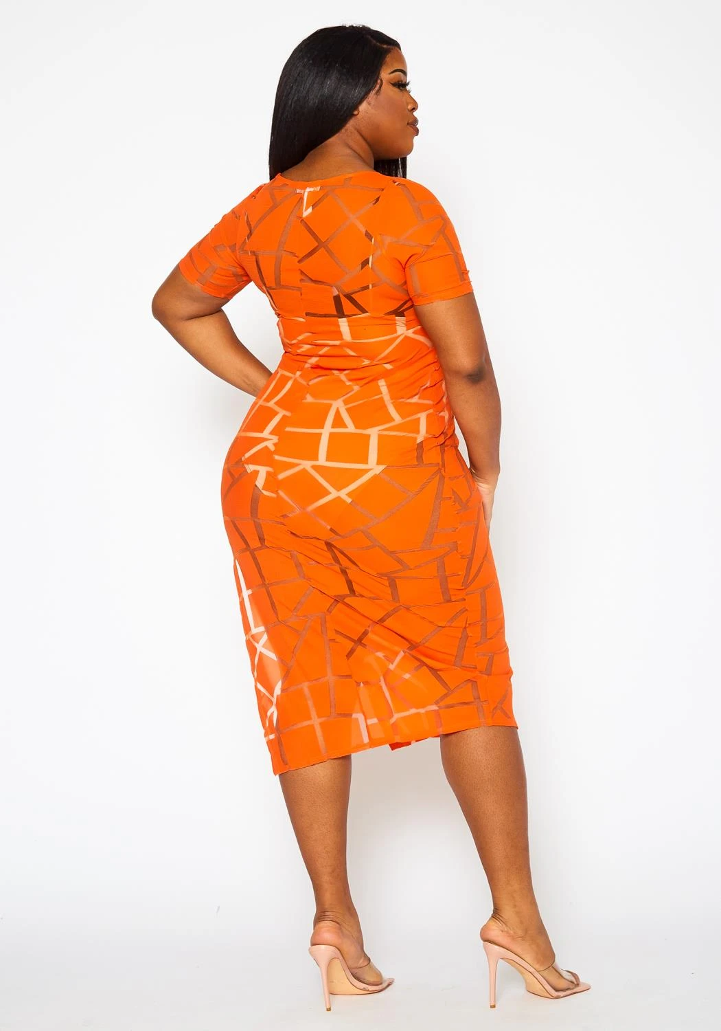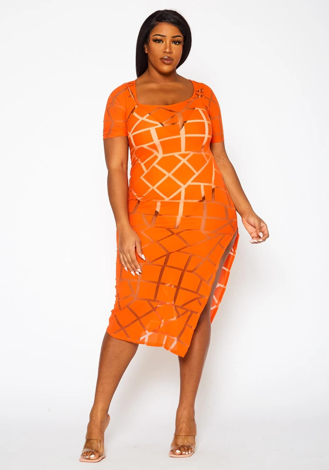 Stunning plus size women’s mesh dress in geometric pattern, square neck style, short sleeves, slit hem and see through style.