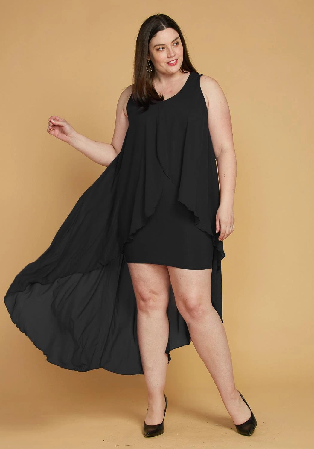 Dramatic chiffon cape dress, perfect for a party. Add some earrings, clutch, and heels and you’re all set.