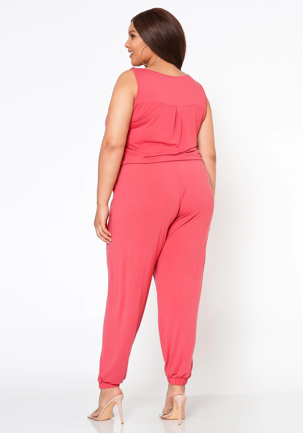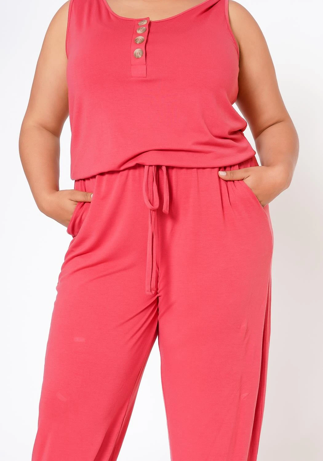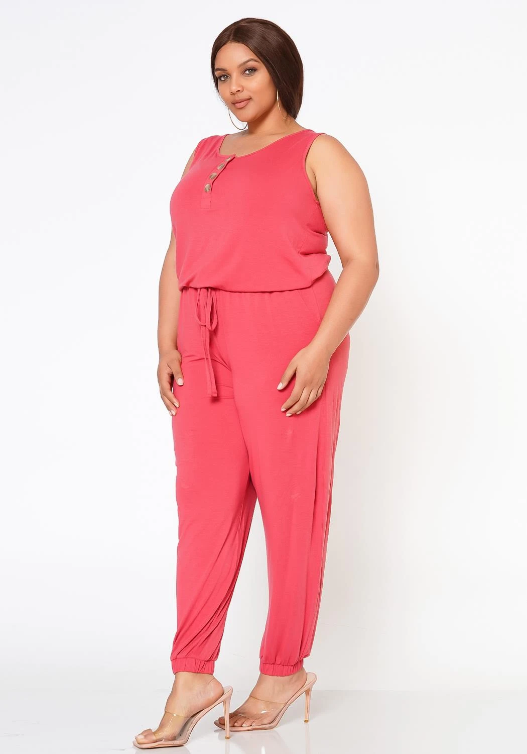 Plus size women’s jumpsuit in sleeveless style featuring round neck ascent, front button closure detail, elastic waistband ascent and drawstring detail.