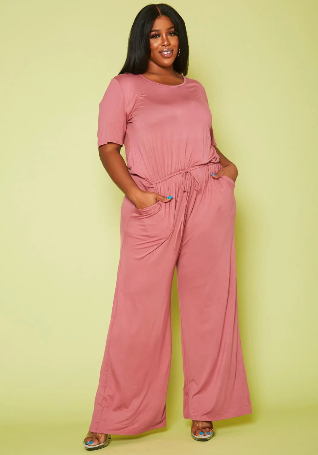 Plus size women’s jumpsuit, featuring a round neck hem, short sleeves, elastic waist drawstring tie-up ascent , pockets & wide leg hem cut.