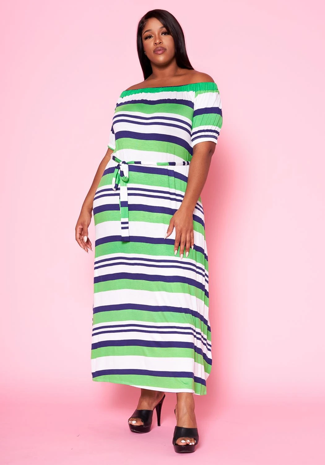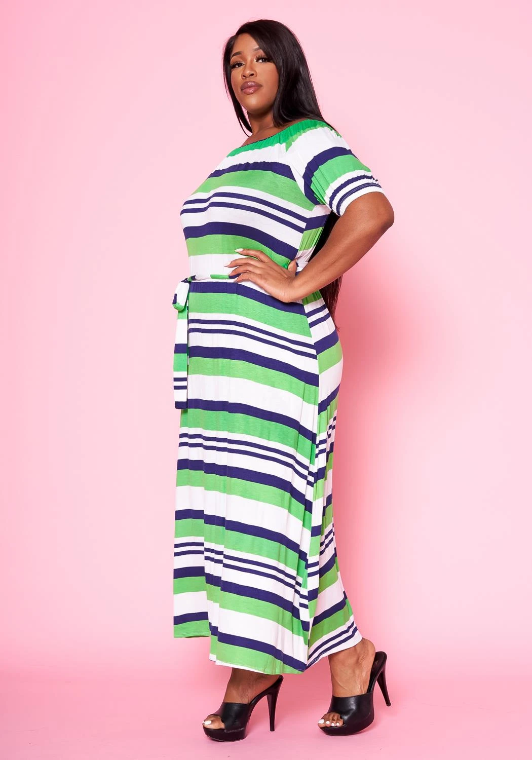 Plus size women’s maxi dress in multi striped pattern, waist tie ascent, boat neckline and short sleeves.
