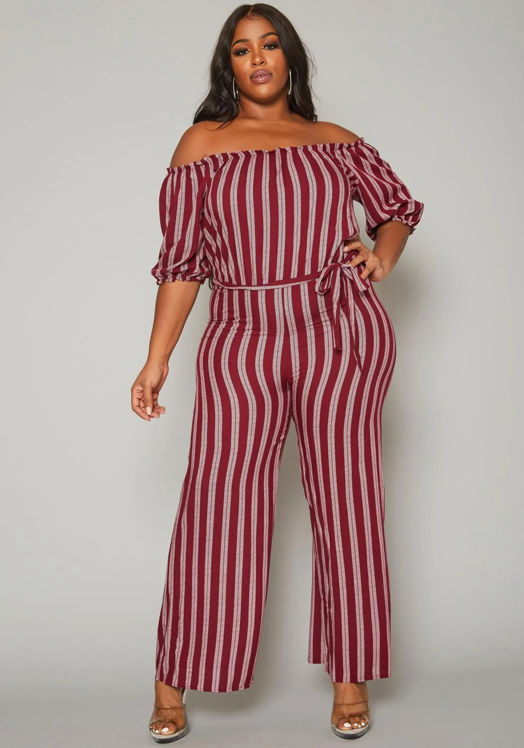 Plus size women’s lovely jumpsuit in striped pattern, off shoulder design, short sleeves, flare leg hem and belted waistline.