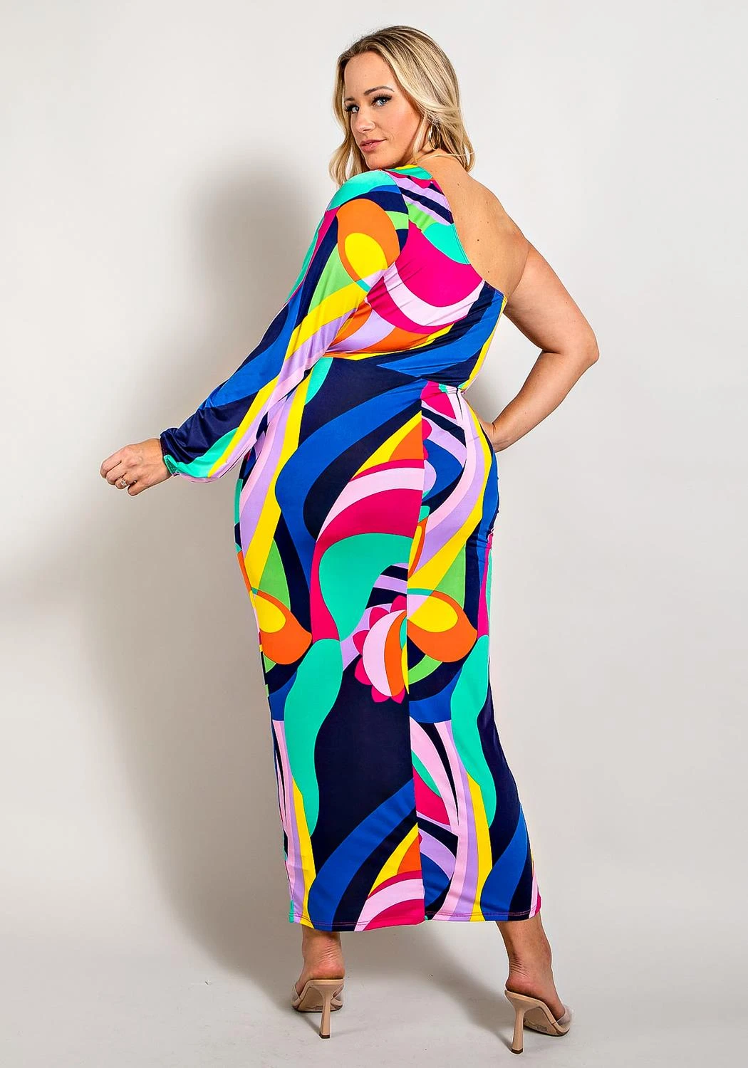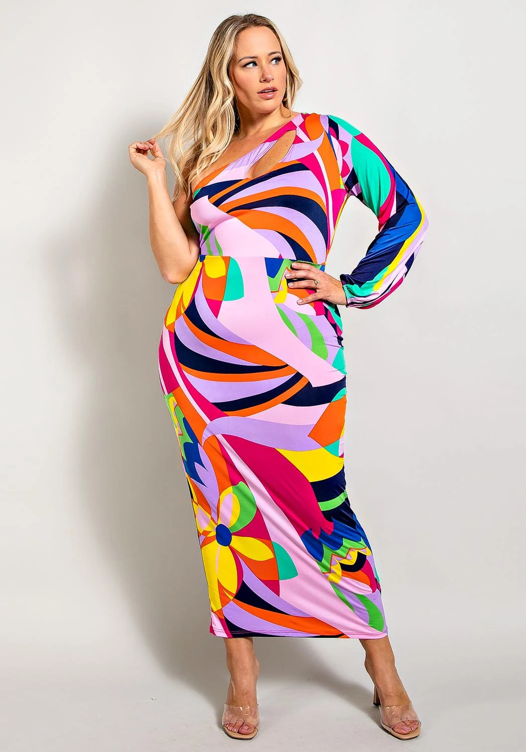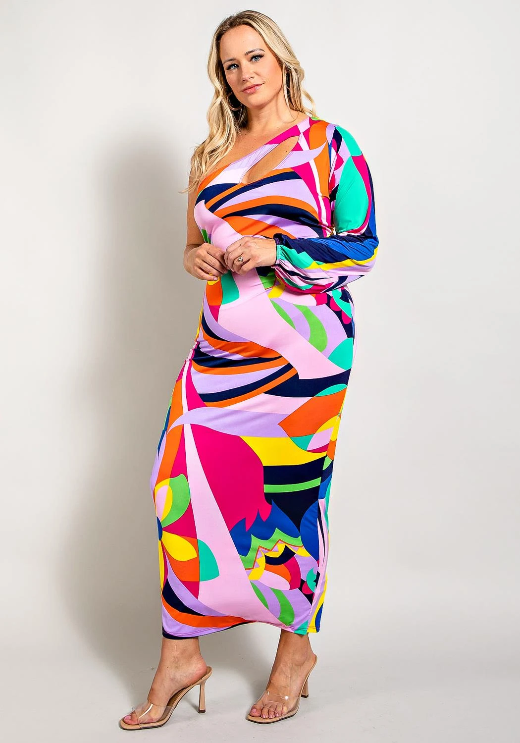 A vencia knit dress featuring an allover abstract print, one shoulder neckline, front cutout detail, long puff sleeve, and a bodycon silhouette.