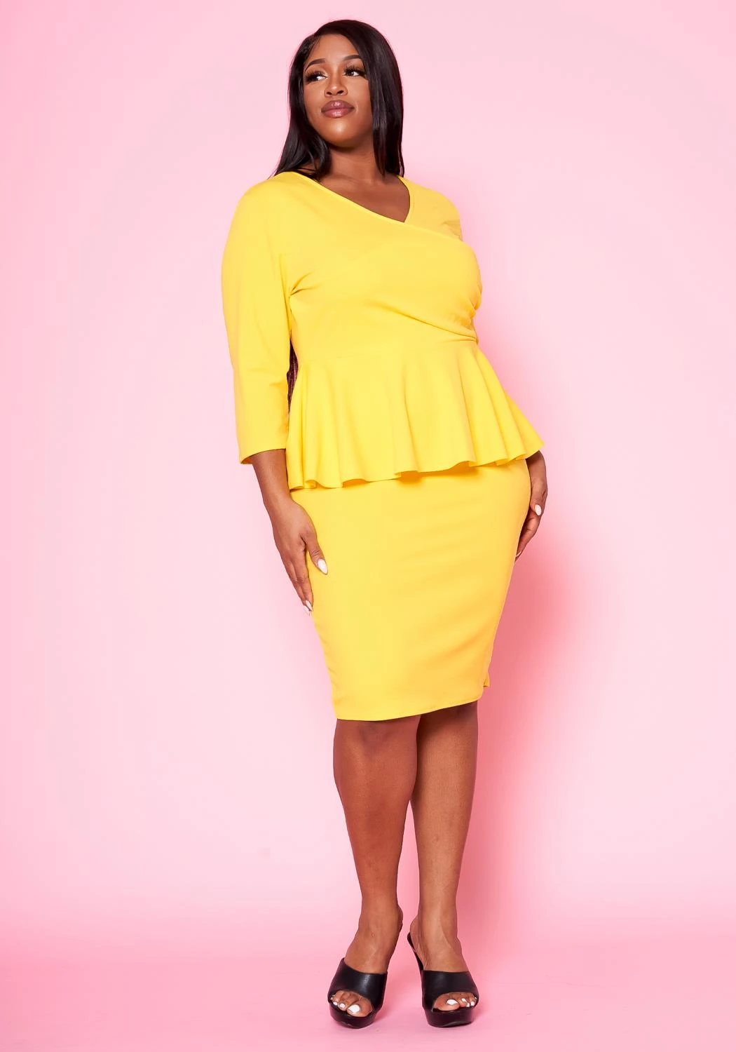 Sophisticated plus size women’s mini dress with peplum flare, v-neckline and 3/4 long sleeves.