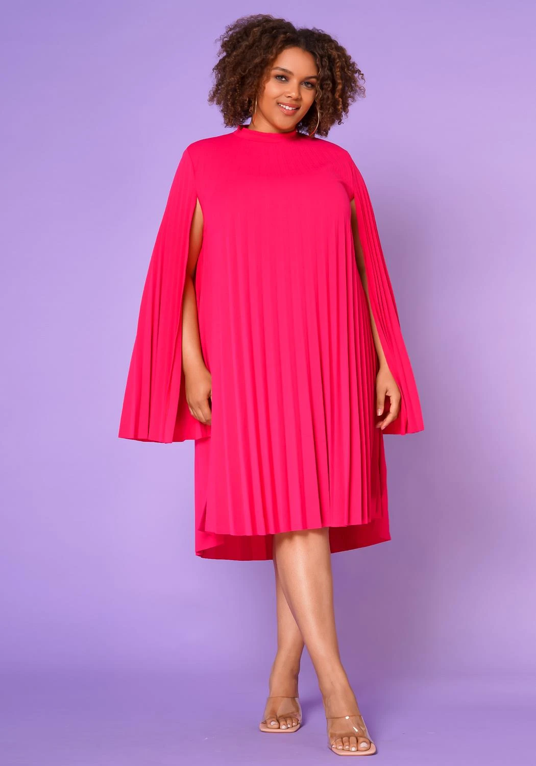 Effortless plus size women’s flare dress in pleated design, cape sleeve style, mock neck and back neck button closure.