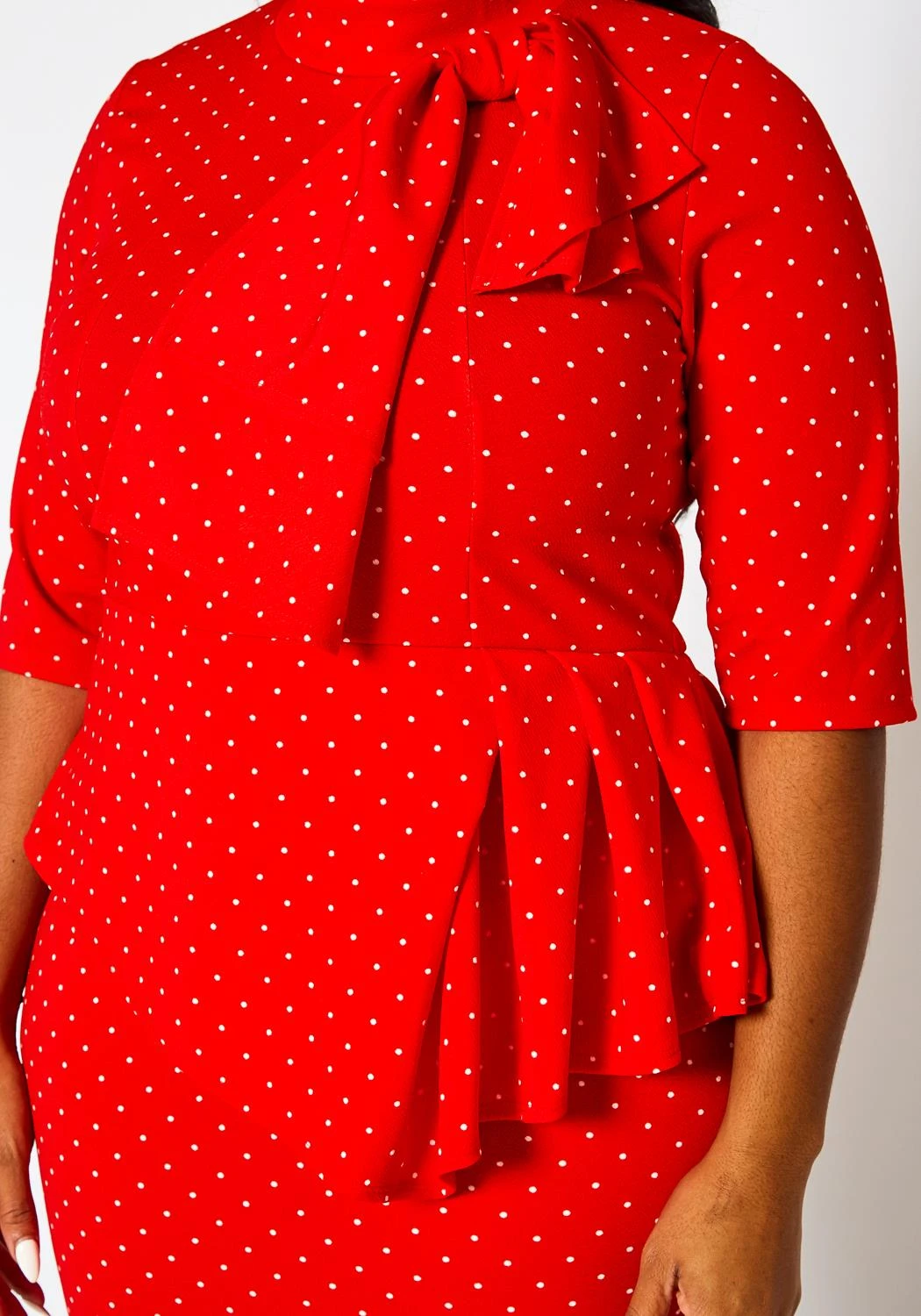 Gorgeous plus size women’s mini dress with polka dot pattern, high neck bow design, waist peplum hem, half sleeves and back zipper closure.
