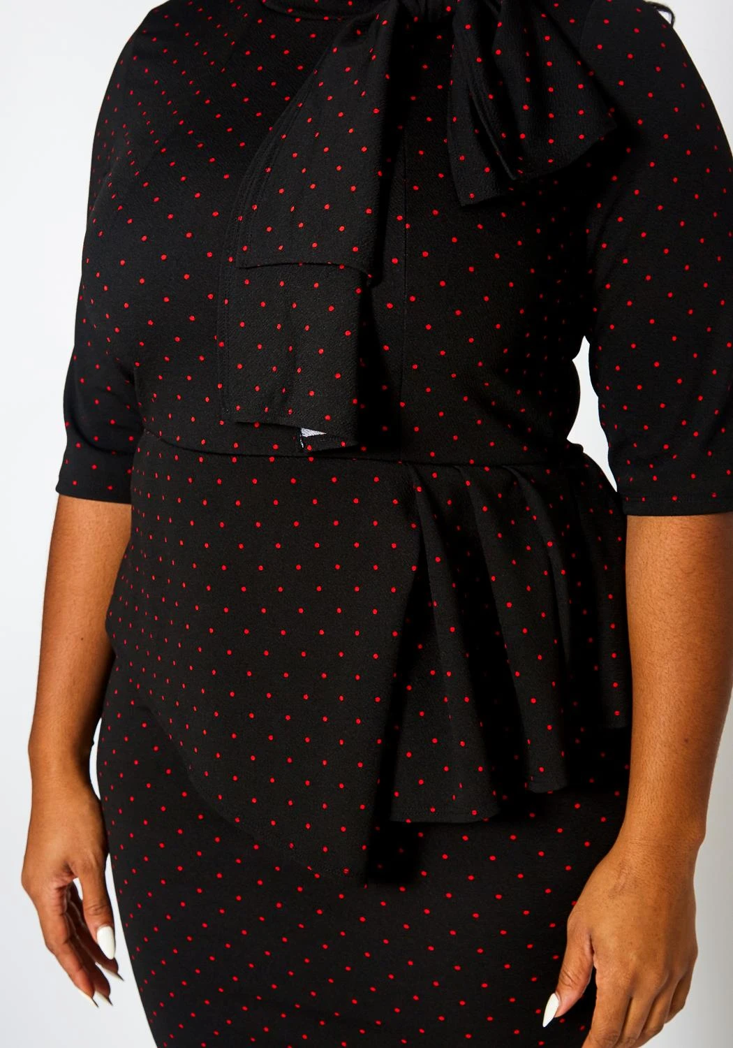 Gorgeous plus size women’s mini dress with polka dot pattern, high neck bow design, waist peplum hem, half sleeves and back zipper closure.