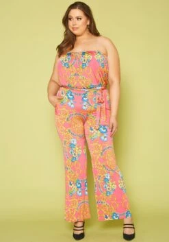 Timeless plus size women’s jumpsuit in lovely shimmer material, v-neck style, long sleeves, flare leg hem and waist tie ascent.