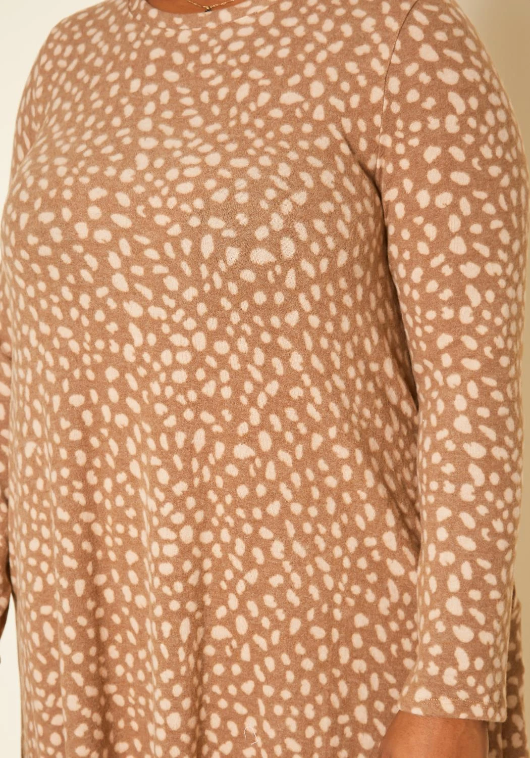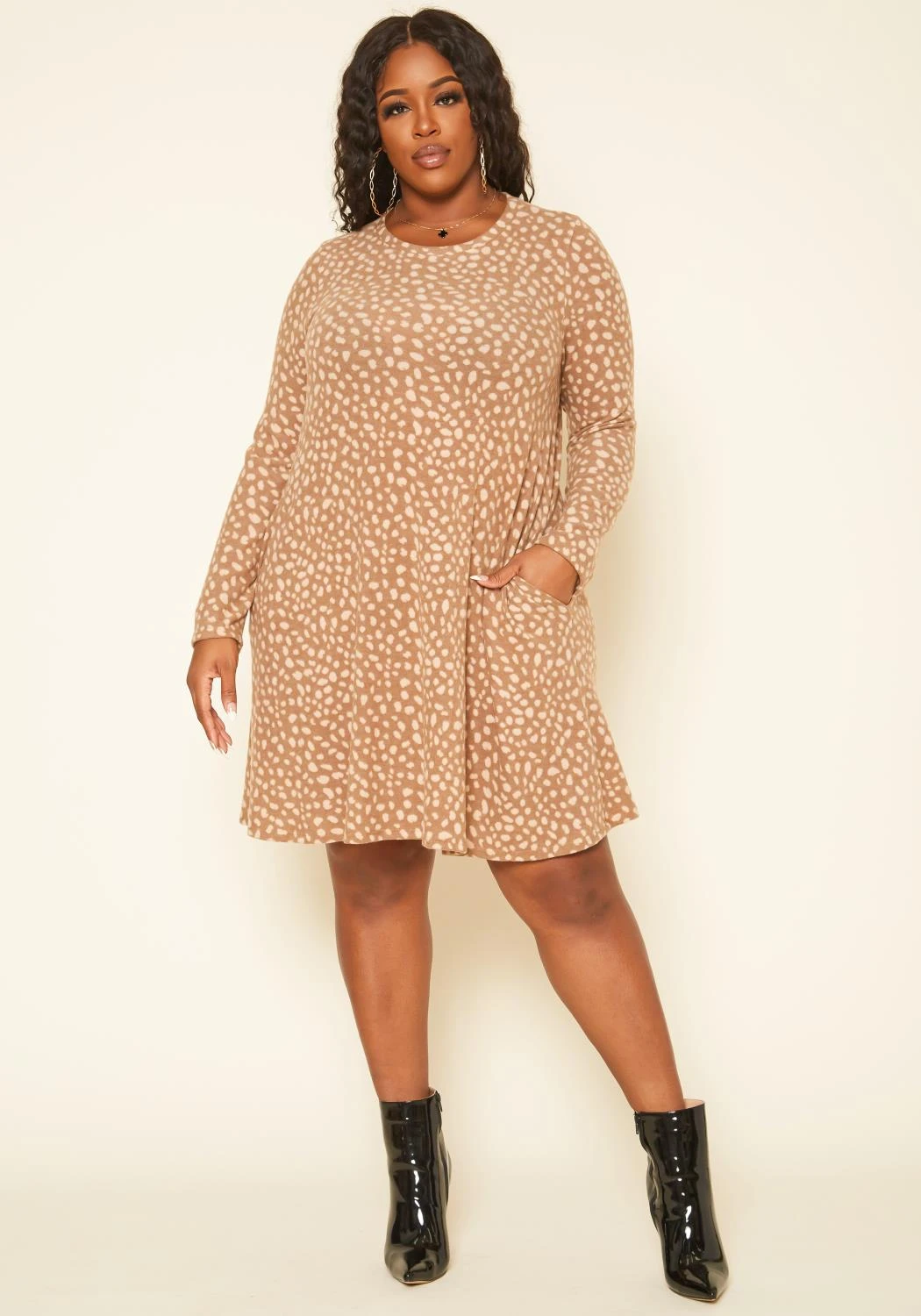 Plus size women’s casual mini dress in dotted pattern, crew neck style, long sleeves, pocket hem and fit to flare design.