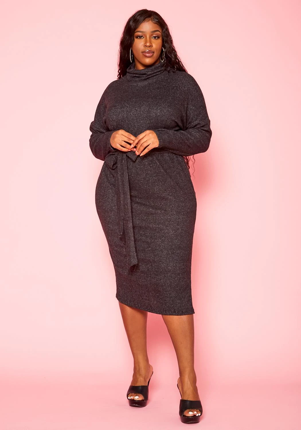 Essential fall season midi dress in warm ribbed knit material, turtleneck style, long sleeves, side slit details and waist tie ascent.