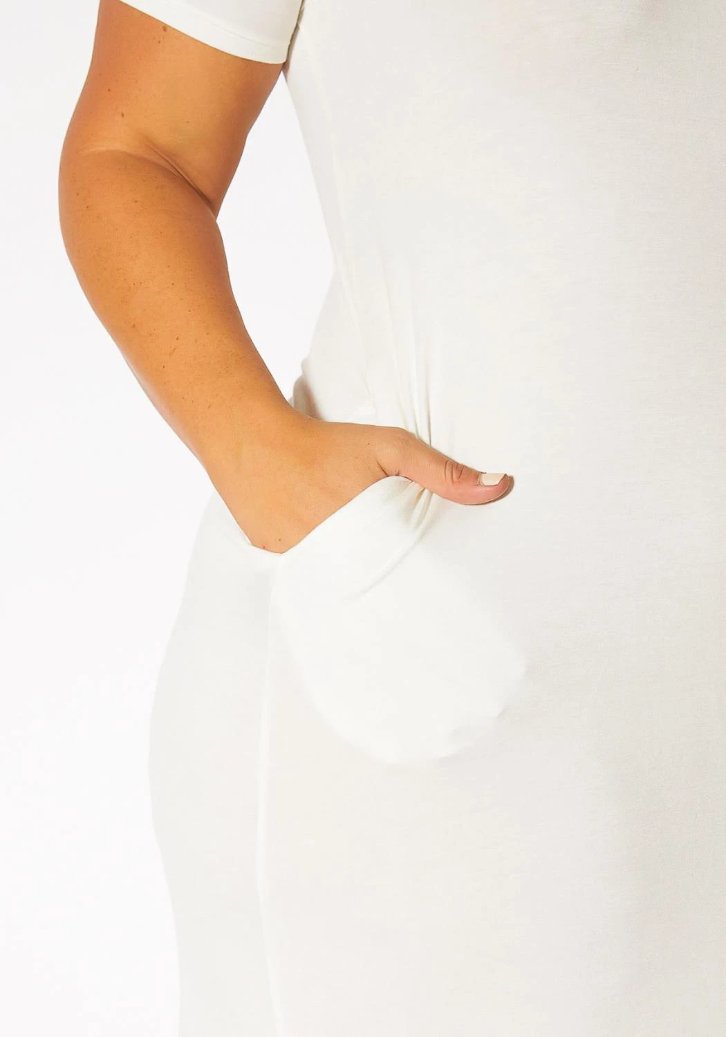 Super casual plus size women’s maxi dress which features functional side pockets, v-neck style and short fitted sleeves.